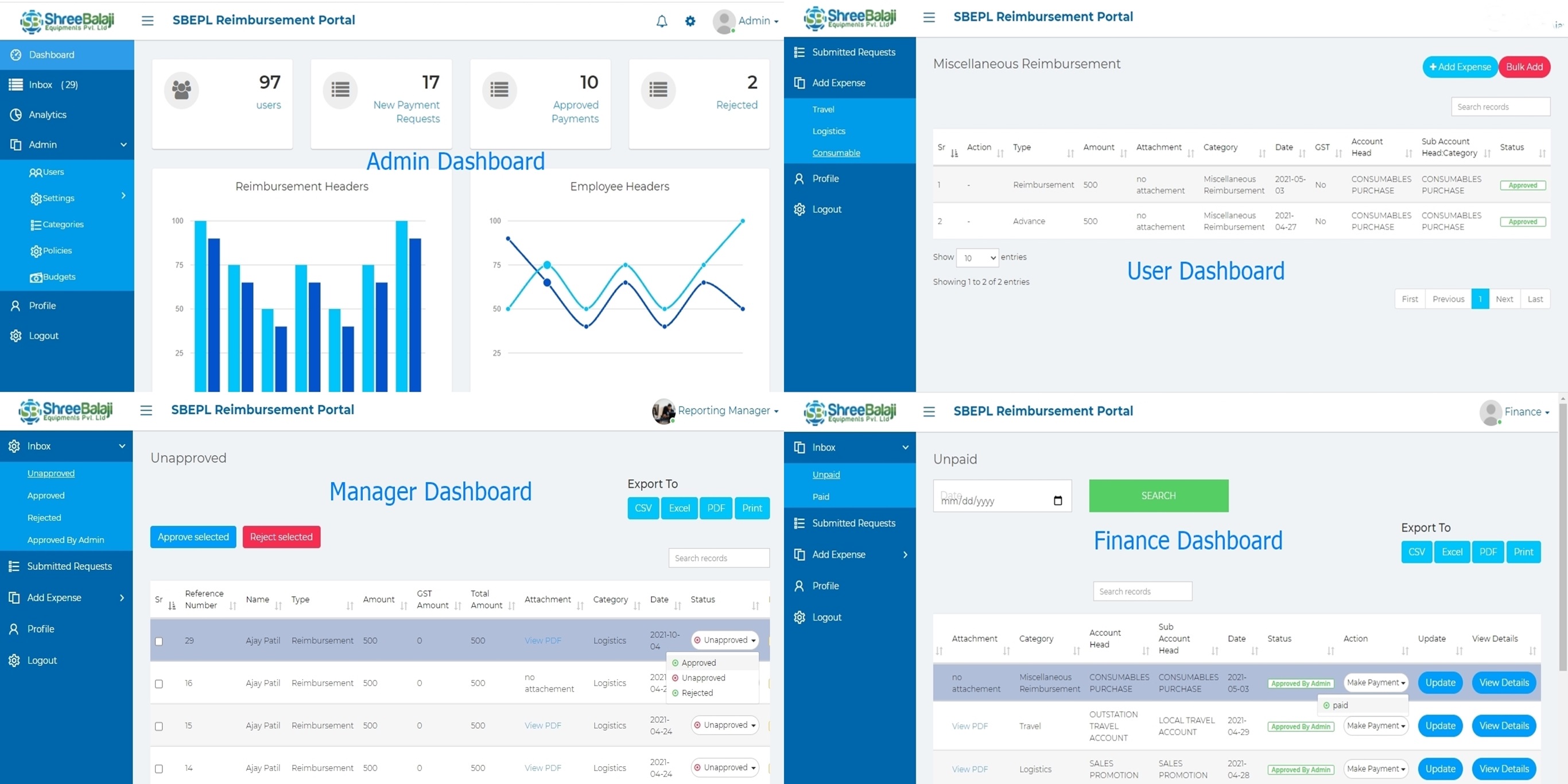 A structured reimbursement system with clearly defined user roles — Employee, Manager, Admin, and Finance. The portal ensures a transparent, step-by-step approval workflow where reimbursement requests move from submission to payment. Each role has specific permissions, streamlining the process and maintaining accountability. GST handling and automated payment processing ensure compliance and efficiency.